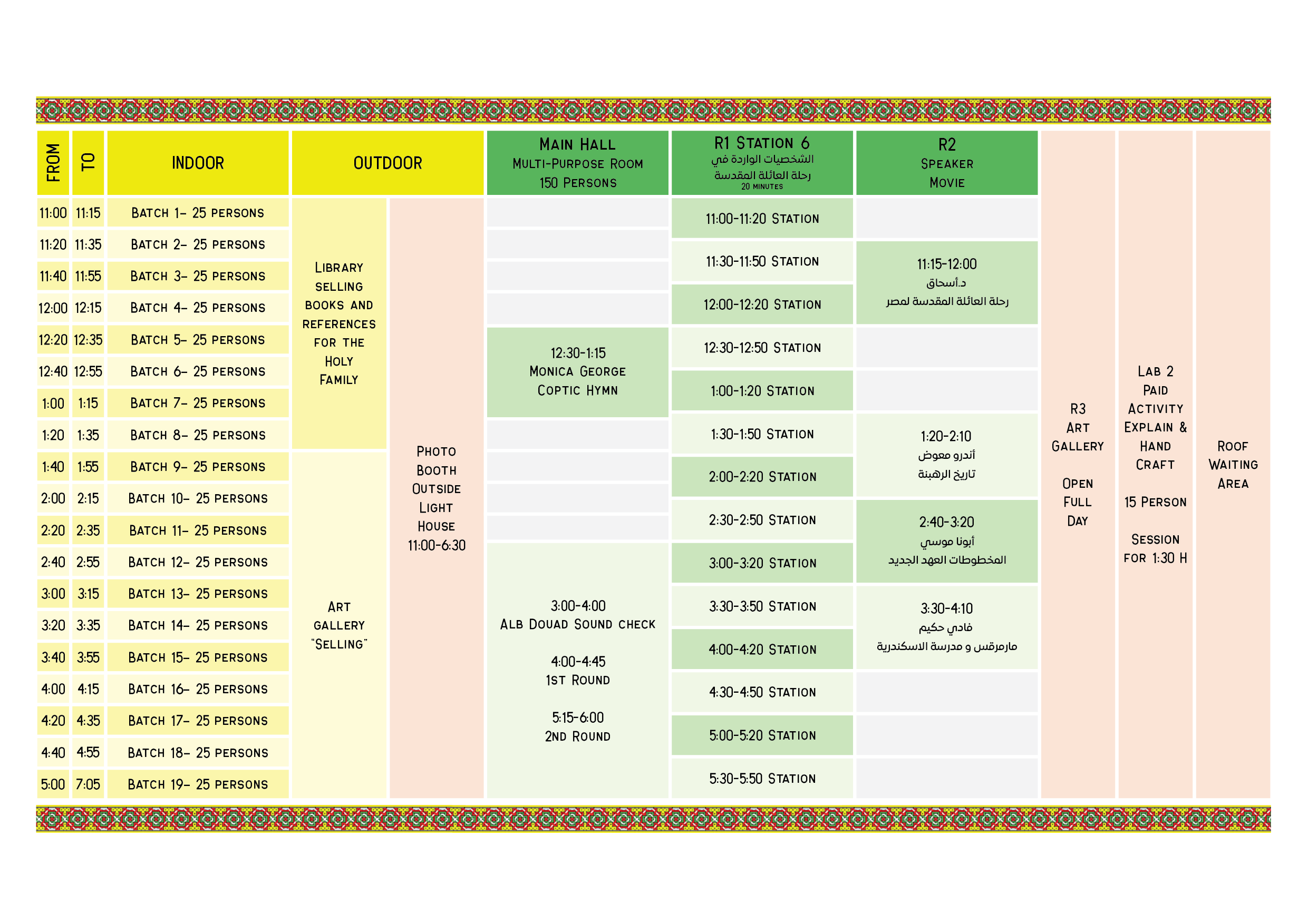 A) One round of the Holy Family Journey to Egypt in the air conditioned St. Athanasius hall, taking in consideration that the round duration is 1h 30 min (the stations includes chairs for the attendees) so please pick your best timing from below